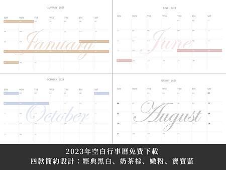 2023 年空白行事曆沿用 2022 年的簡約風行事曆設計,奶茶色、嫩粉色和寶寶藍是永不退流行的三個基本色,另外新增一組經典的黑白灰,總共有四款簡約風行事曆可以免費下載喔:)